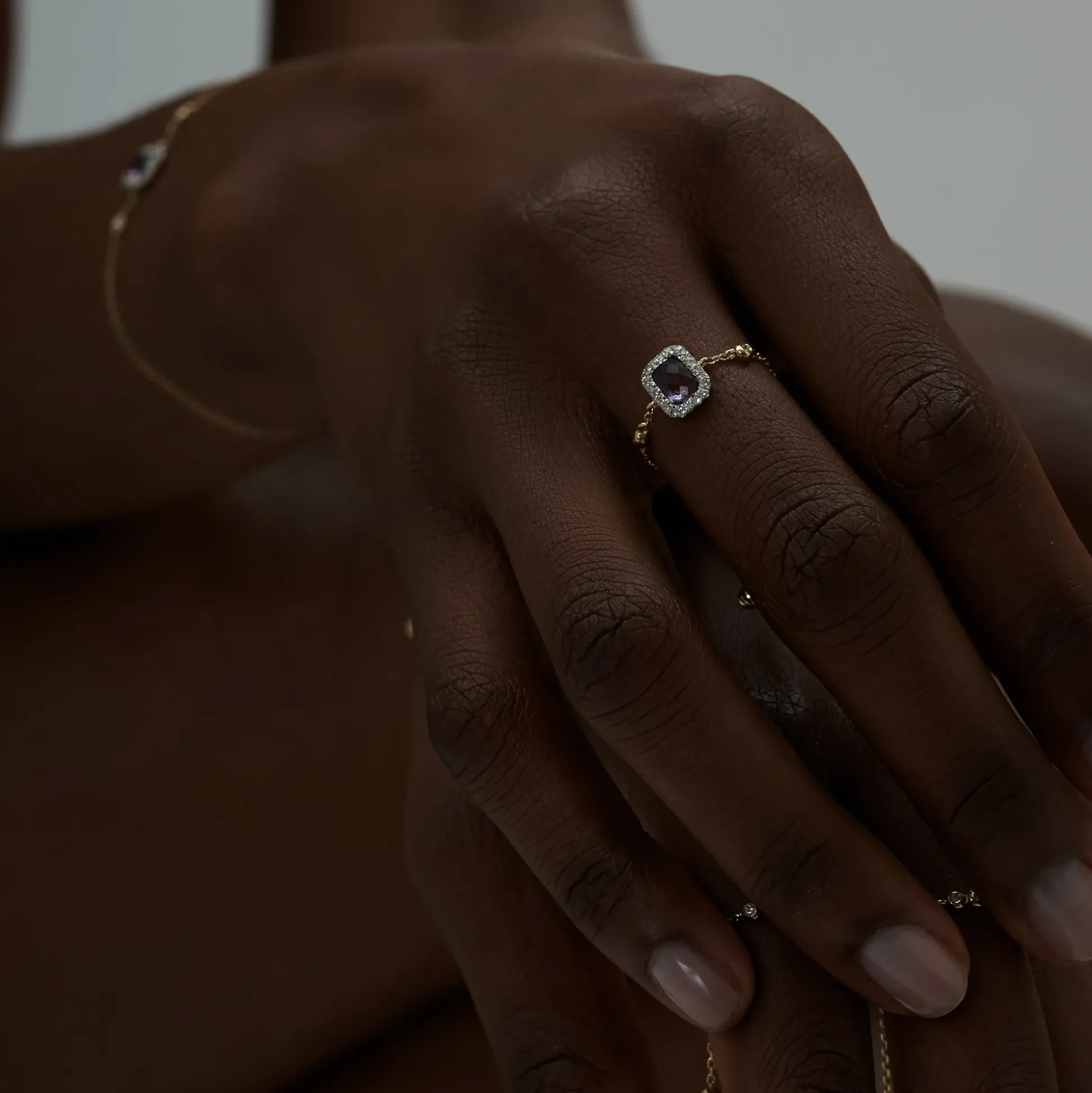 This Ring Is Hand-Set With A Shimmering Purple Amethyst Illuminated By A Frame Of Diamonds – Together The Stones Are Meant To Symbolise Everlasting Love. It’S Designed With The Brand’S Signature Gold Sliding Chain, Which Can Be Adjusted To Fit Around The Finger Of Your Choice. Complement It With The Matching Bracelet.